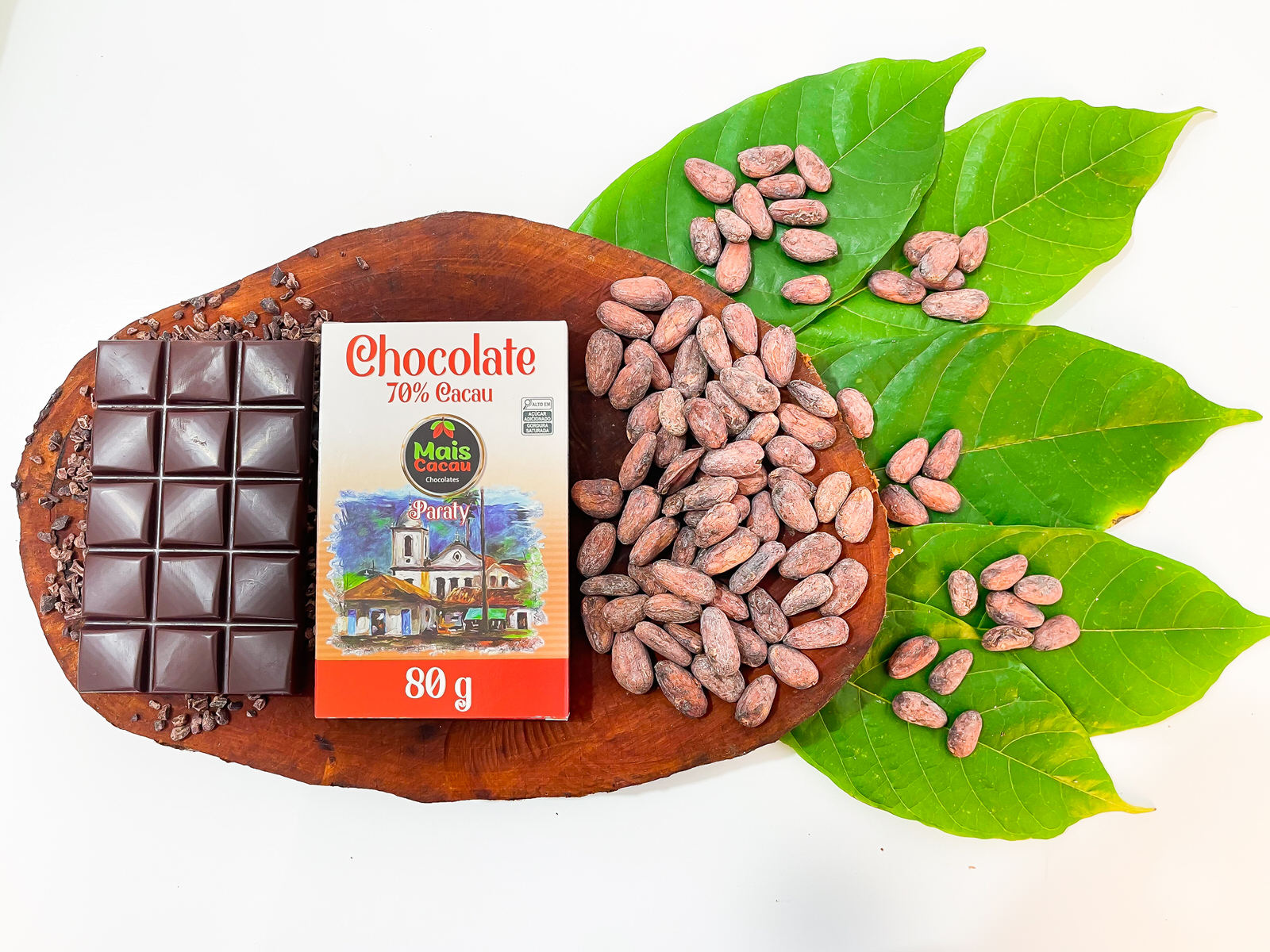 Chocolate 70% cacau, produzido com apenas dois ingredientes: cacau e açúcar orgânico, sem lactose, sem conservantes, sem aromatizantes e livre de glúten.