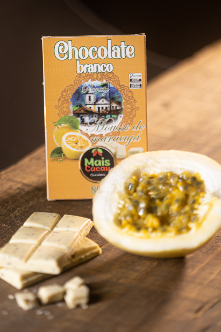 Chocolate branco com maracujá, sem conservantes, sem aromatizantes, sem glúten e livre de gordura vegetal.